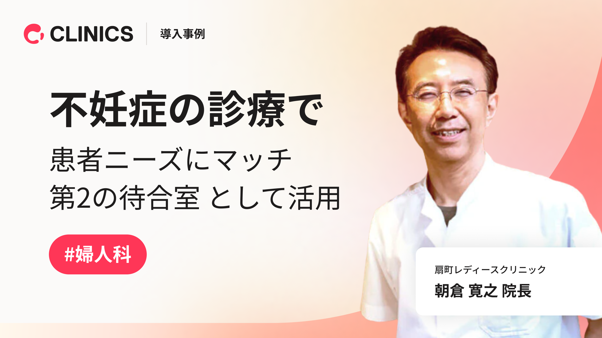 2004年、「医療を通じて人々に生きる幸せをつたえよう」という理念のもと、扇町レディースクリニックは設立された。院長である朝倉先生の考える「患者の立場にとって正しく、苦痛のない産婦人科医療」を体現する医療施設として、不妊症治療を中心とした質の高い総合産婦人科医療を提供し、数多くの患者が集まっており、患者に寄り添った医療をさらに進化させるべく、2017年3月よりCLINICSを活用したオンライン診療を開始した。