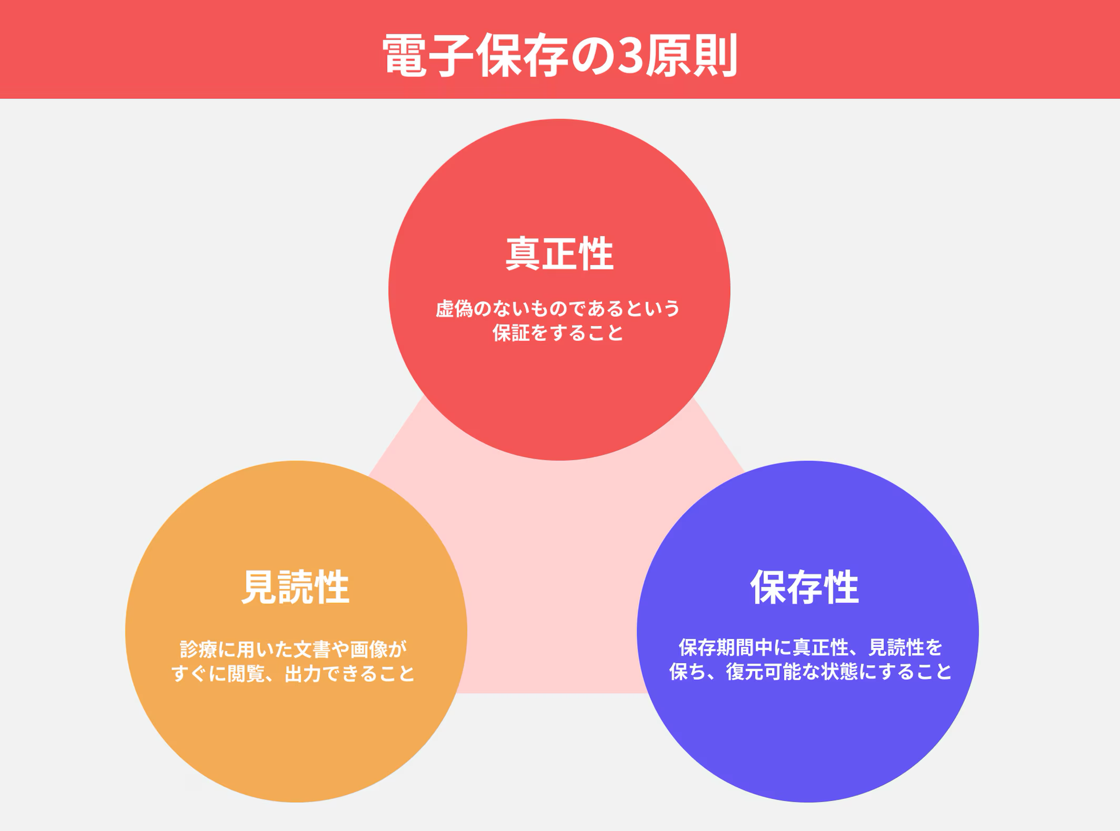 電子保存の三原則 電子保存の三原則とは、電子的にカルテを保存・管理する場合に満たさなければならない、「真正性」「見読性」「保存性」の3つの基準のこと。詳しくは、医療情報の安全管理ルール「電子保存の三原則」の知っておくべき重要なポイントを参照ください。 |