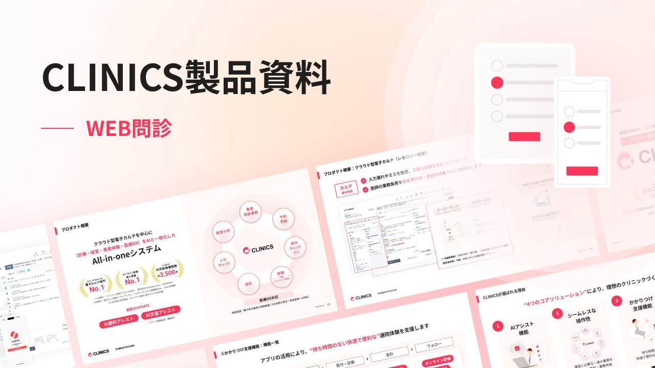 CLINICSのWEB問診について、機能の概要や特長をまとめた資料をご用意しています。導入のご検討や、社内での情報共有にぜひご活用ください。