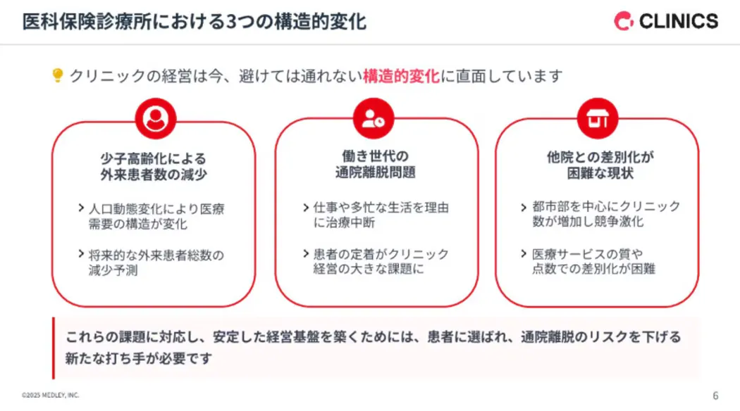 本資料では、オンライン診療がいかにして患者さんの負担を軽減して通院を継続させ、持続可能なクリニック経営に繋がるのか、その具体的な仕組みと経営上のメリットを詳しく解説しております。皆さまのクリニックにおける長期的な経営戦略の策定に向け、ぜひご活用いただければと思います。