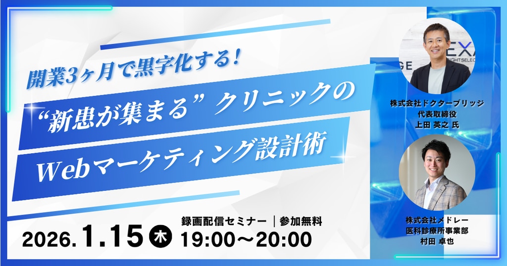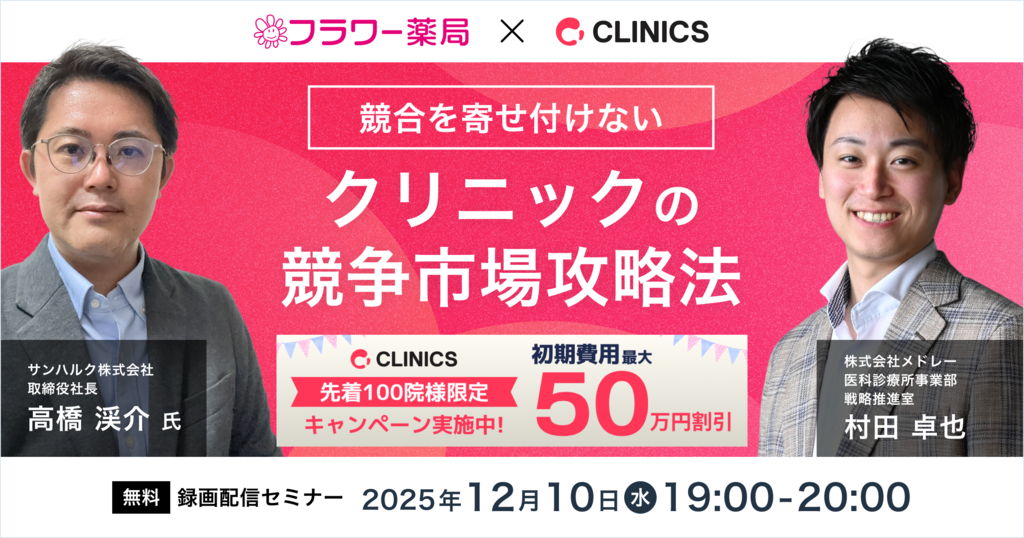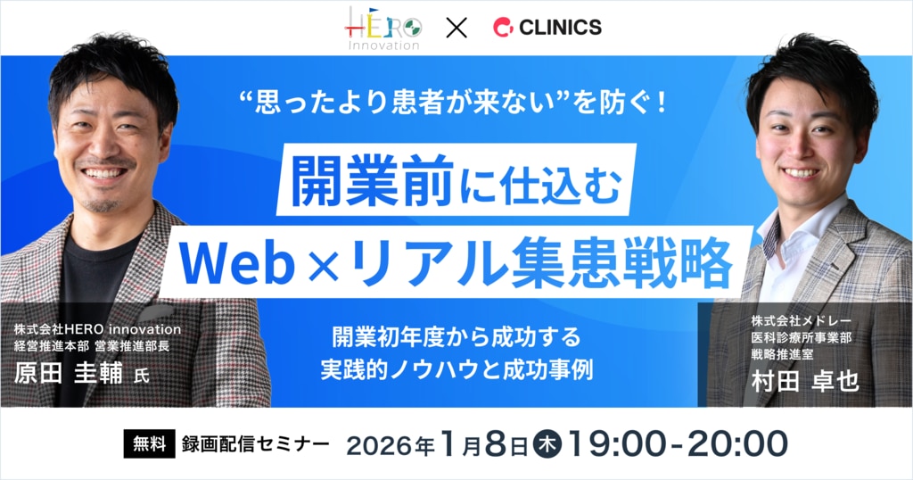本セミナーでは、医療機関の開業支援から経営課題解決、成長戦略の立案まで幅広くサポートしてきた株式会社HERO innovationの営業責任者が登壇し、患者の受診行動に基づいた集患戦略をWebとリアルの両面から解説します。