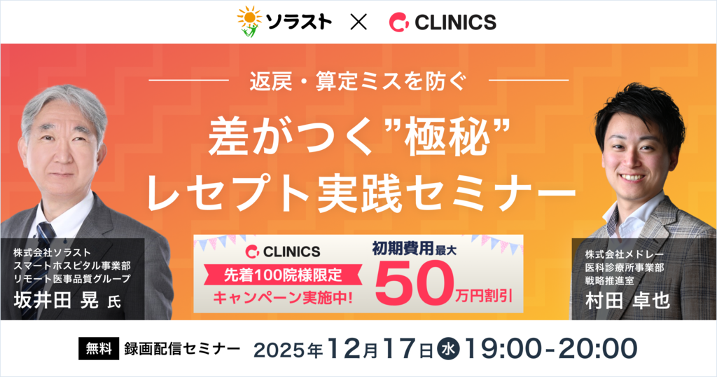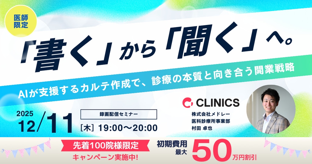 本セミナーでは、AIが「書く業務」をどう支援し、医師をストレスから解放するか。CLINICSカルテのデモを交えながら体系的にご紹介します。