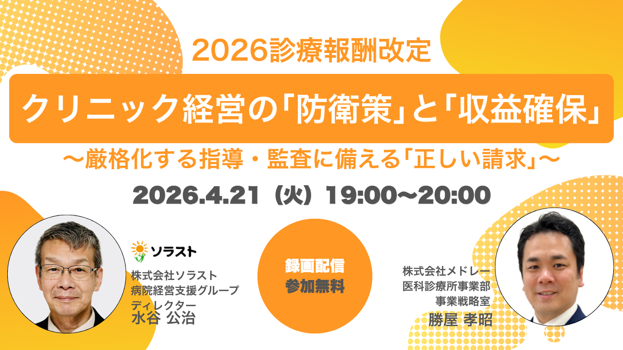 本セミナーでは、生活習慣病管理や在宅医療の評価見直しといった最新動向を徹底解説。さらに、厳格化する個別指導・監査への「防衛策」として、事務負担を抑えつつ、意図しない請求漏れやカルテ記載の不備を防ぐための具体策を提示します。