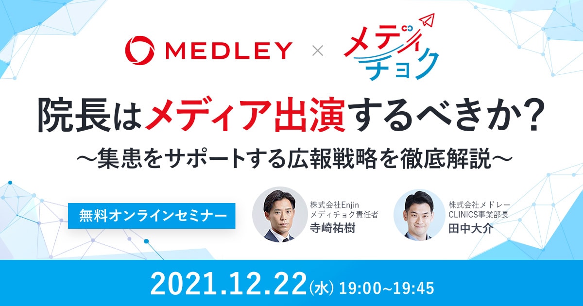 クリニック経営者様なら、一度は広告・PR・ブランディングを考えたことがあるのではないでしょうか。しかし、広告やPRは高度なスキルが必要な為、なかなか効果的な施策の実施が難しい方が多いと存じます。そこで、クリニックPRのプロであるメディチョク責任者である寺崎様をお呼びして徹底解説頂きます。「4ヶ月で10件掲載」「Yahoo!ニュース掲載、キー局テレビ、ラジオ出演」「広告換算価値は約1,000万円。Yahoo!ニュースにも転載」など実際の事例をご紹介いたします!