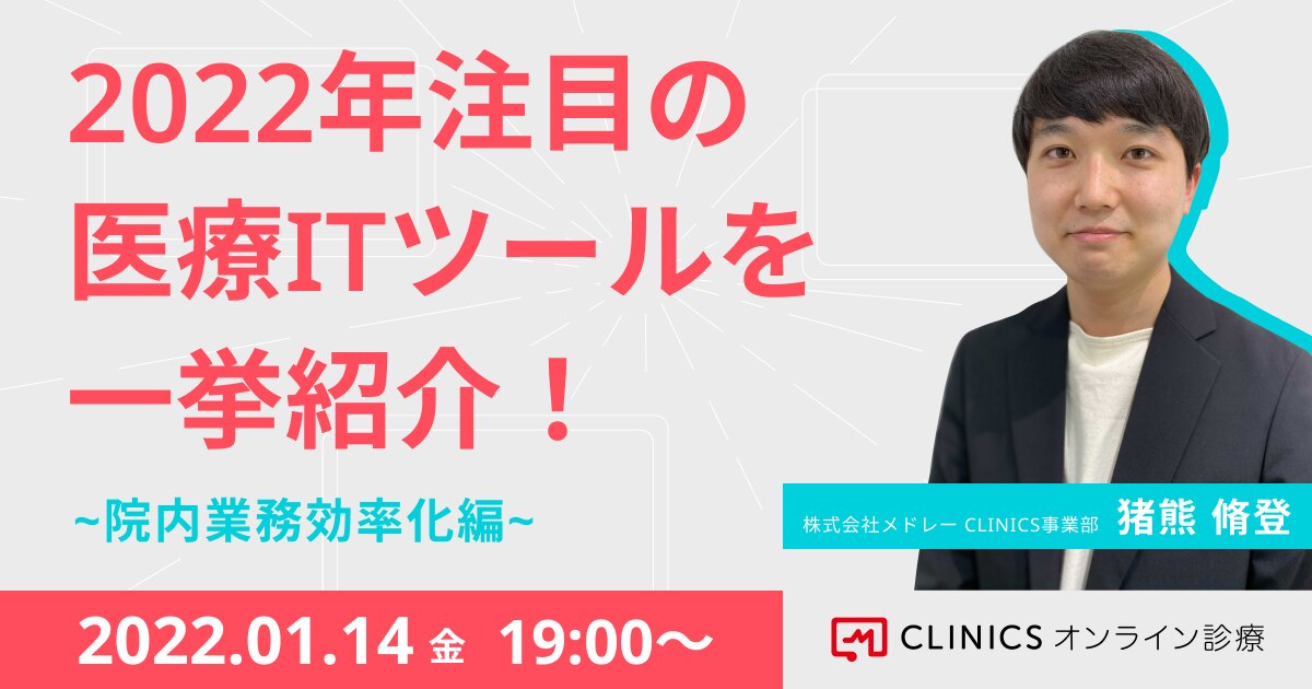 本セミナーでは昨年一気に導入が増えたITツールを、クリニックにおいて導入し活用するまでのコツとあわせて幅広い観点でご紹介いたします。