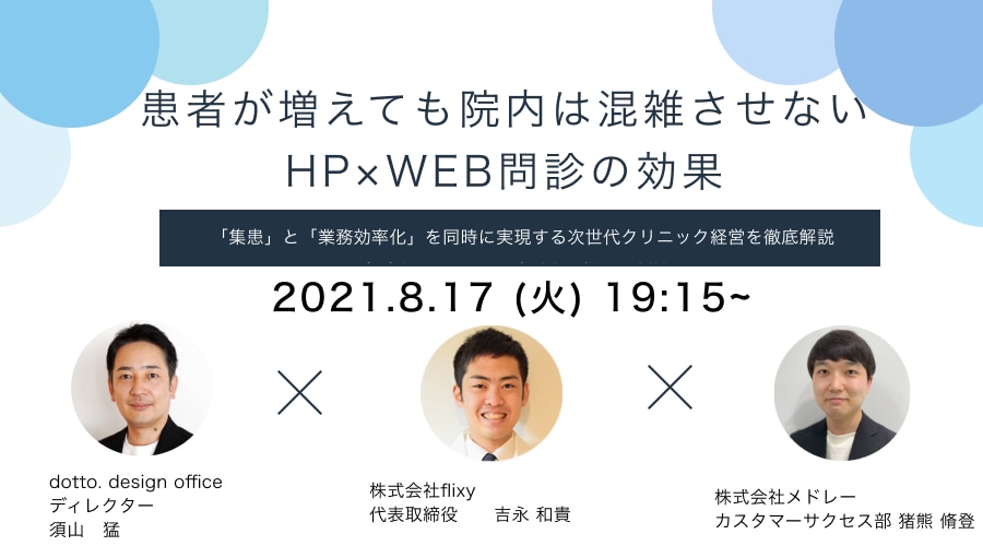 数々のデザイン性の高いHPを手掛けるドットデザインの須山様と、導入数No.1のメルプWEB問診を提供するフリクシーの吉永先生をお招きし、時代にそったクリニック経営のポイントとなるHP作成からWEB問診を使った効果について伺います。